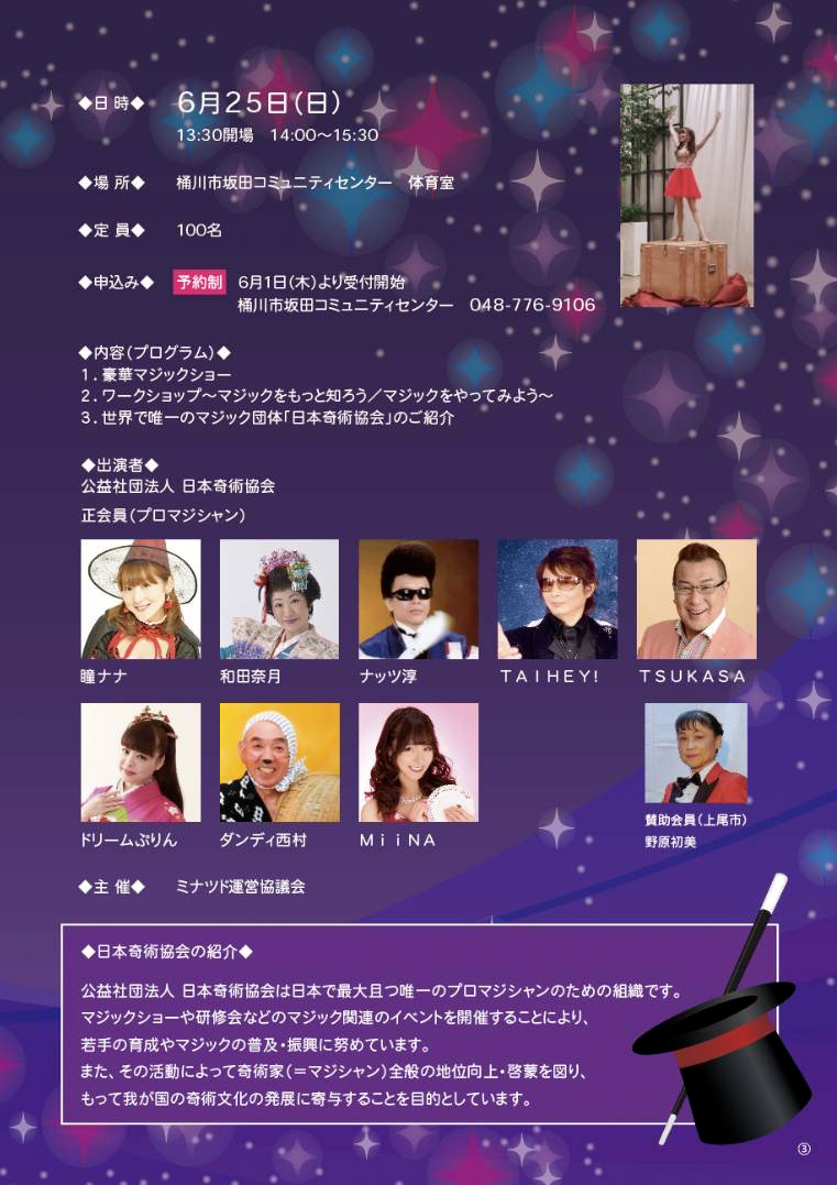 | 西洋マジック | イリュージョン | 和妻 | 子供向けイベント | その他 |